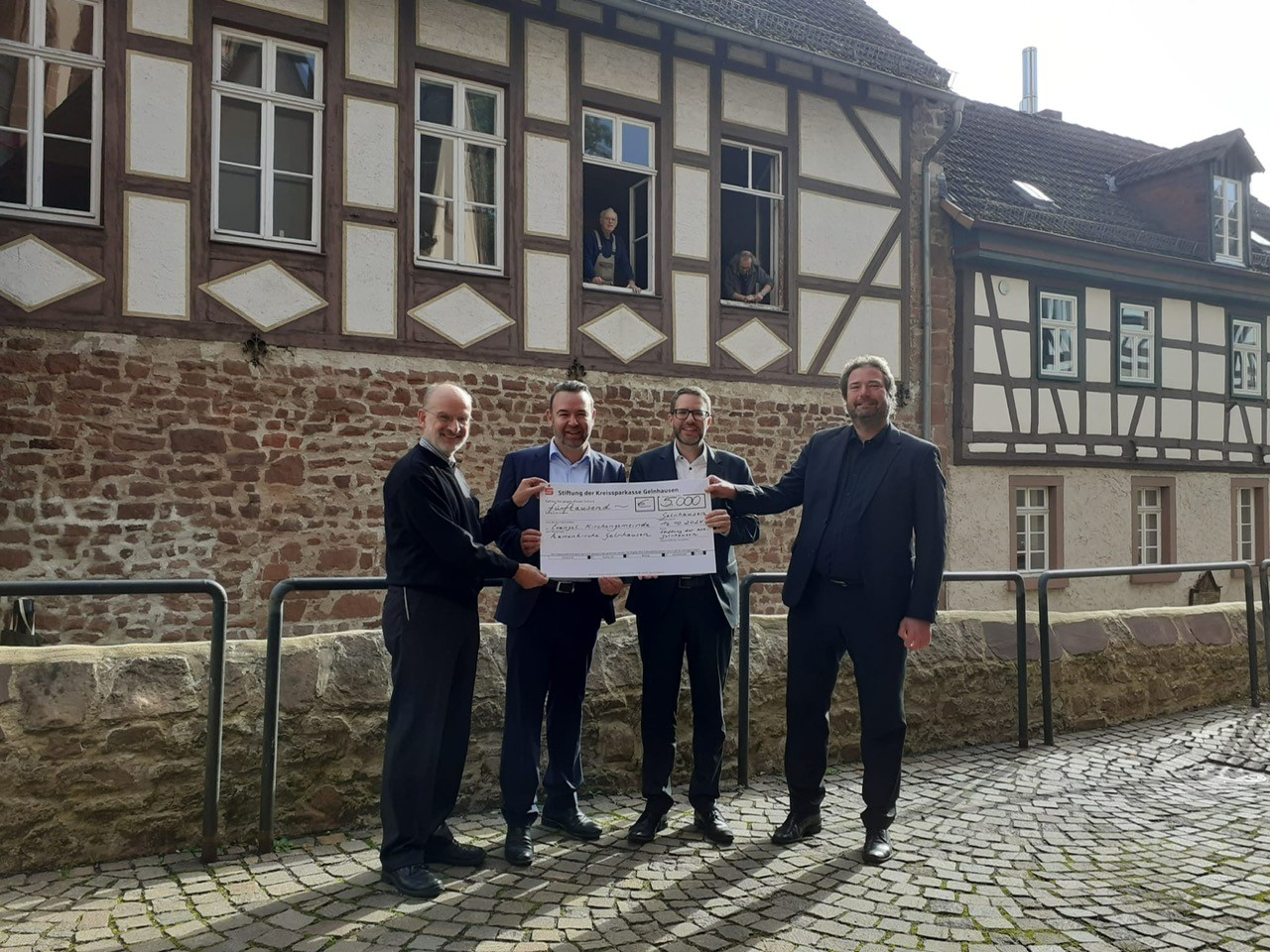 Vor dem Steitz haben Landrat Thorsten Stolz, Vorsitzender des Kuratoriums der Stiftung der Kreissparkasse Gelnhausen, und Tobias Zipf, Vorstandsmitglied der Stiftung der Kreissparkasse Gelnhausen, der evangelischen Kirchengemeinde Marienkirche Gelnhausen einen symbolischen Spendenscheck in Höhe von 5.000 Euro überreicht.